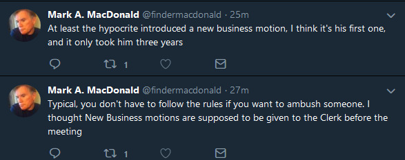Even after the council meeting, MacDonald doubled down, sending two more tweets, accusing McIntosh of ambushing him and not following proper procedure.
