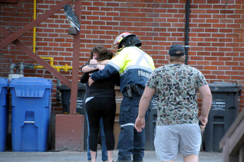 One of the tenants is consoled by relatives and a member of Cornwall-SDG Paramedic Services at the scene of an apartment fire on McConnell Avenue in Cornwall, Ont. on Wednesday, April 29, 2020. (Newswtach Group/Bill Kingston)
