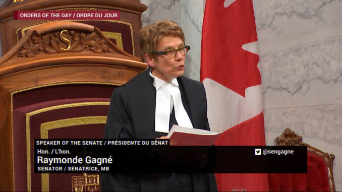 Speaker Raymond Gagne delivers a decision on a question of privledge during a sitting of the Senate of Canada on Tuesday, Dec. 5, 2023. (Senate of Canada via Newswatch Group)