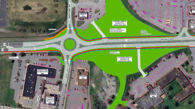 A diagram from a Monday, Oct. 27, 2025 Cornwall City Council agenda shows the changes for the area around Seventh Street West and Brookdale Avenue that will create additional green space. (City of Cornwall via Newswatch Group)
