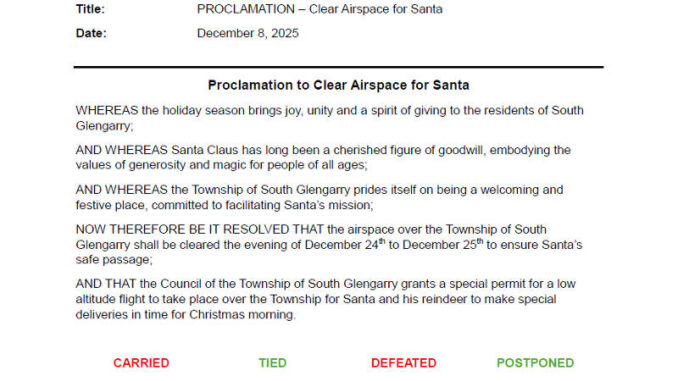 South Glengarry's colourized proclamation for clean airspace for Santa Claus on Monday, Dec. 8, 2025. (South Glengarry via Newswatch Group)