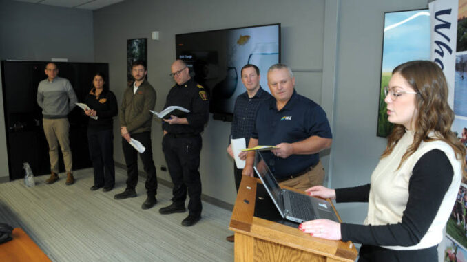 Officials take part in a mock news conference for Exercise Trillium Response on Saturday, Jan. 31, 2026. Pictured (from left) are South Dundas CAO Ben de Haan, Eastern Ontario Health Unit Operations Manager Catherine Dufresne, CN Dangerous Goods Officer Zachary Fortin, South Glengarry Deputy Fire Chief Bill Chafe, South Glengarry Mayor Lachlan McDonald, South Dundas Mayor Jason Broad and South Dundas Emergency Information Officer Fraser-Dupuis. (Newswatch Group/Bill Kingston)
