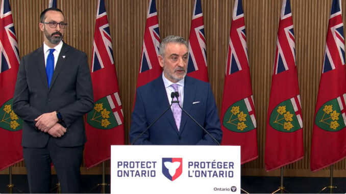 Ontario Education Minister Paul Calandra speaks to reporters on Monday, April 13, 2026. Also shown is Colleges and Universities Minister Nolan Quinn. (Province of Ontario/YouTube via Newswatch Group)