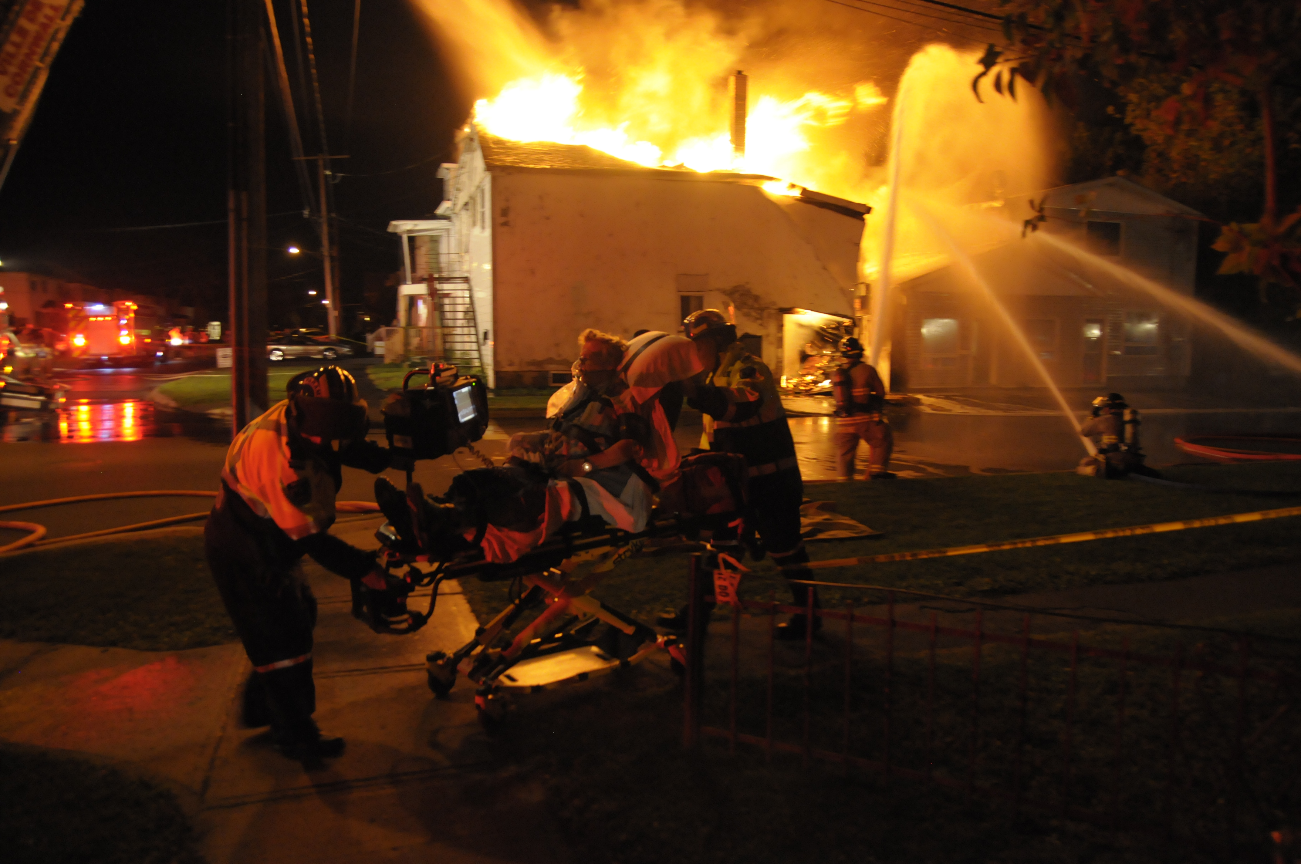 Alice-St-Fire-Oct0114-12 An unidentified person is taken away by paramedics on a stretcher while firefighters continue to fight the inferno. It’s unclear whether the person was hurt in the fire.