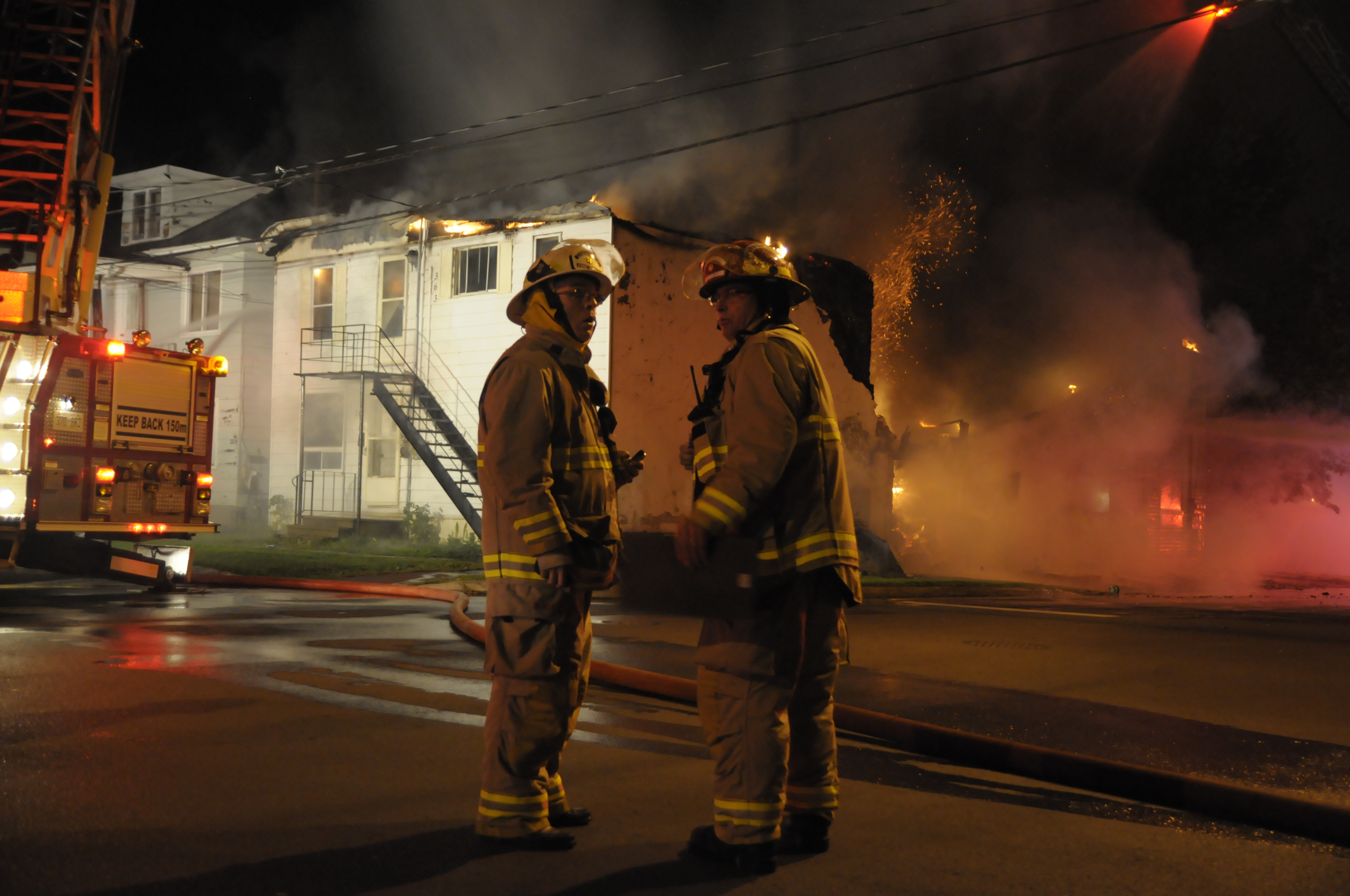 Alice-St-Fire-Oct0114-15 Two firefighters talk while sparks fly from the blaze in the background. (Cornwall Newswatch/File)