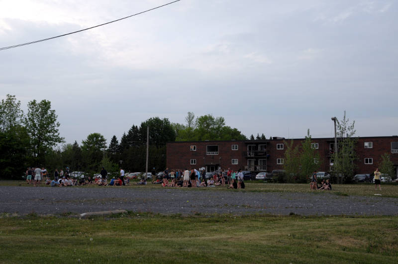 Students and staff of the Ontario Hockey Academy congregate in a safe area away from a dorm fire Thursday, May 26, 2016. The building, which houses 90 students, was destroyed. (Newswatch Group/Bill Kingston)