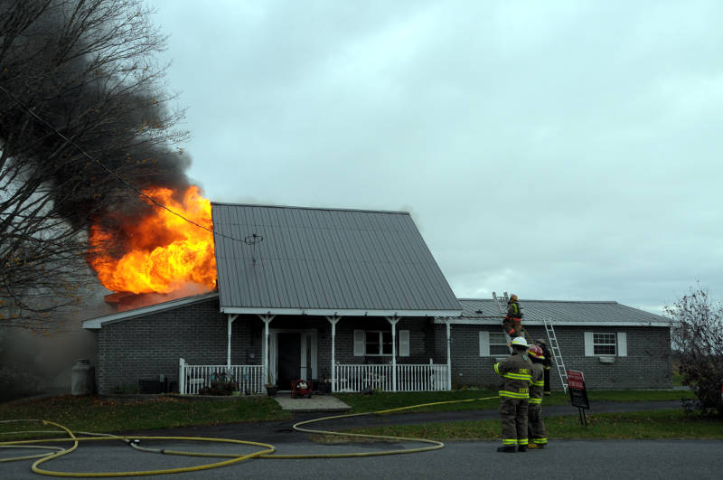 sandtown-road-house-fire-oct2516-68-edited A South Stormont firefighter makes his way to the roof of this house on Sandtown Road on Tuesday, Oct. 25, 2016. The home was destroyed by the blaze. (Newswatch Group/Bill Kingston)